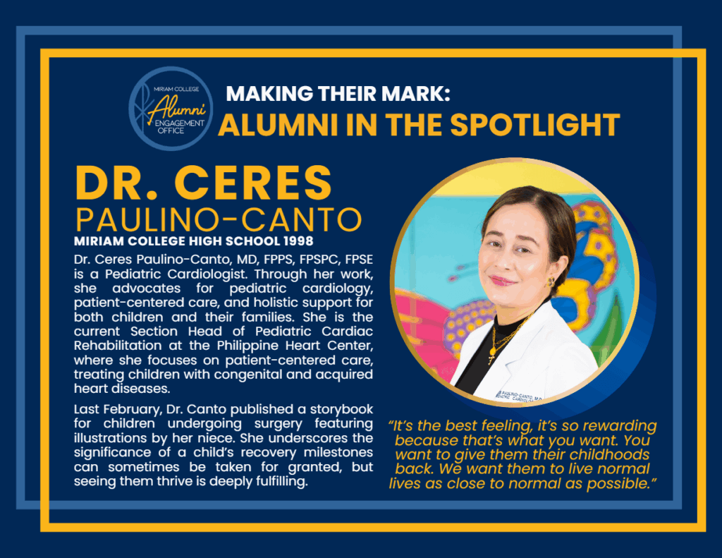 Dr. Ceres Paulino-Canto, MD, FPPS, FPSPC, FPSE is a Pediatric Cardiologist and Miriam College High School alumna of Class 1998. ...